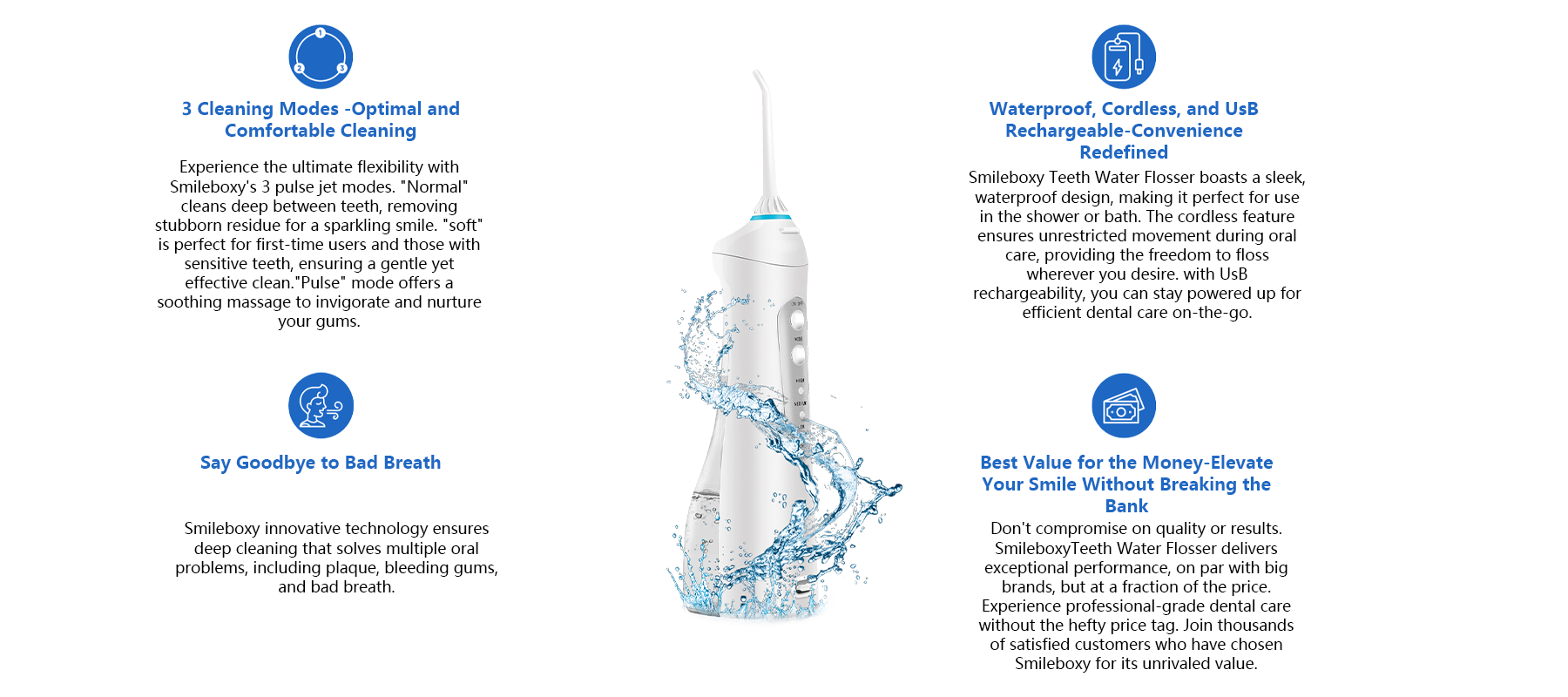 Gentle, Efficient, and Dentist-Recommended - Say Goodbye to Time-Consuming Flossing And Elevate Your Oral Care with the Smileboxy Teeth Water Flosser.