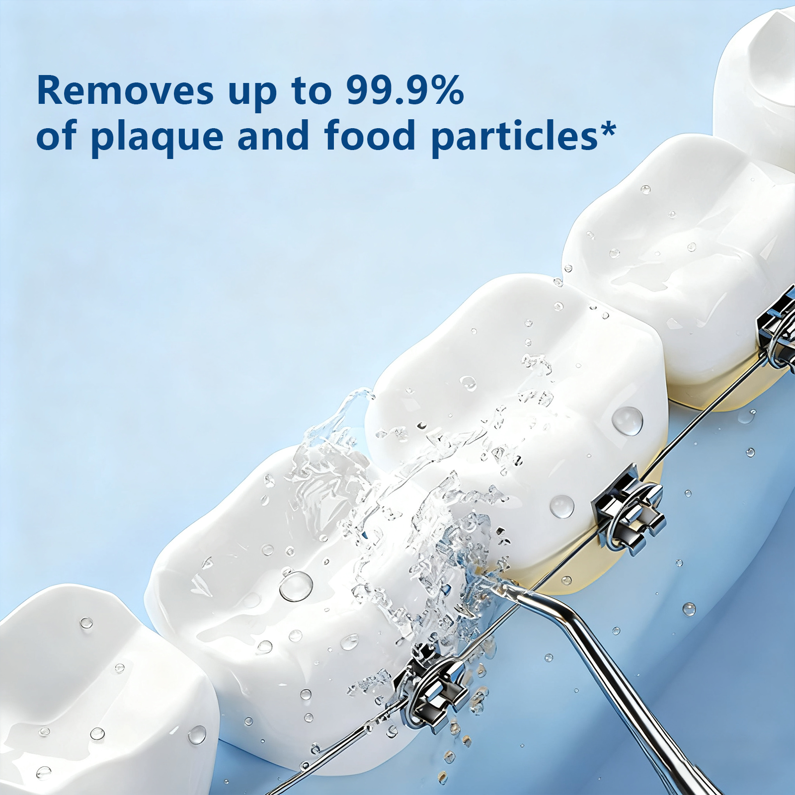 The Smileboxy Water Flosser uses gentle, powerful pulses of water to effectively remove 99.9% of plaque, food particles, and stains – even from areas where traditional dental floss can not reach.